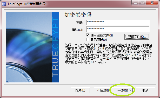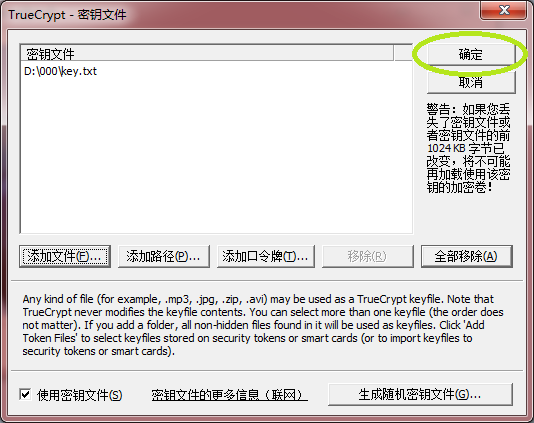 以上3图为同时使用密码和密钥文件D:\000\key.txt的情况,如果使用了密钥文件,请一定注意保存该文件,因为加载加密卷的时候必须提供此文件才能解密,如果丢失此文件那么加密卷将永远不可能被加载,所以推荐随机使用网络上大量存在的图片,或者是某个简单的txt文本文档,这样万一密钥文件丢失还可以比较容易地再次取得。密钥文件可以是一个或多个,如果使用了多个文件,加载加密卷时必须提供所有的文件。通常,采用多个密钥,并将副本分发给不同的人,然后销毁原密钥,可以实现许多影视作品中描述的某些情形,即只有收集齐所有密钥文件后才能解密加密卷,个人日常使用不推荐使用密钥文件,采用仅密码的方式更为方便,而且足够安全。