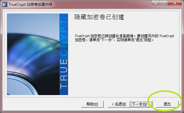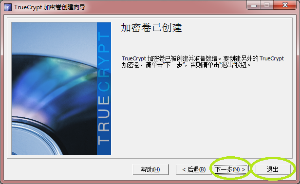 点击“退出”按钮,退出加密卷创建向导;点击“下一步”按钮,继续创建另一个加密卷