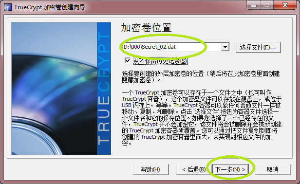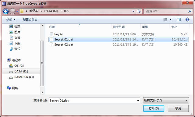 点击“选择文件”按钮,在对话框中指定加密卷的路径、文件名和扩展名,示例为D:\000\Secret_01.dat