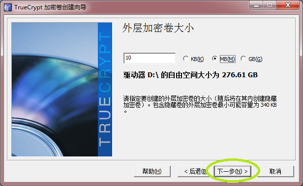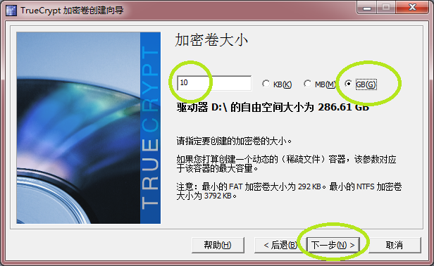 指定加密卷的大小,加密卷越大,可存储的文件越多,示例为10G,点下一步