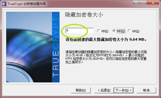 在TrueCrypt中,大保险柜叫做“外层加密卷”,小保险柜叫做“隐藏加密卷”,显然,外层加密卷的大小一定要大于隐藏加密卷,在下面的示例中,取外层加密卷10M,隐藏加密卷8M,余下的2M用于放迷惑别人的虚假文件,如果这2M被用完,那么隐藏加密卷的8M空间就会被侵占,隐藏加密卷即被破坏,不过TrueCrypt提供了一种安全模式,在此模式下,如果虚假文件超过2M则会提示用户,避免隐藏加密卷遭破坏。