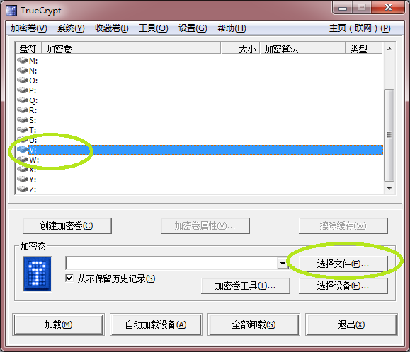 为加密卷选择一个盘符,例如V:,点“选择文件”按钮