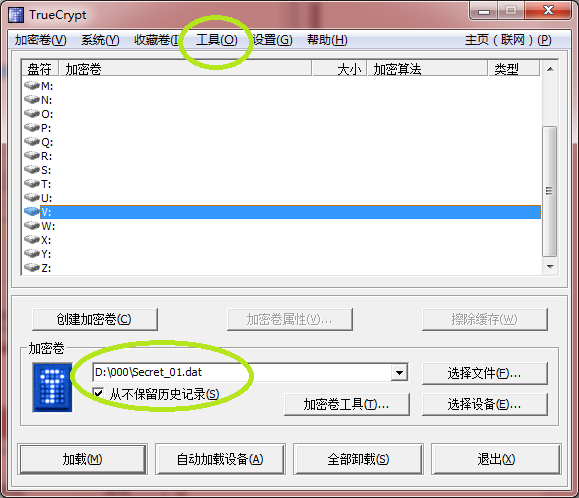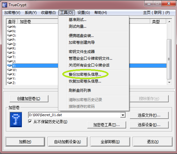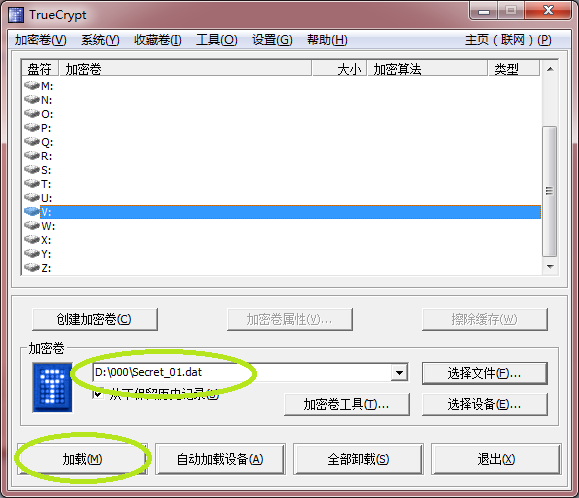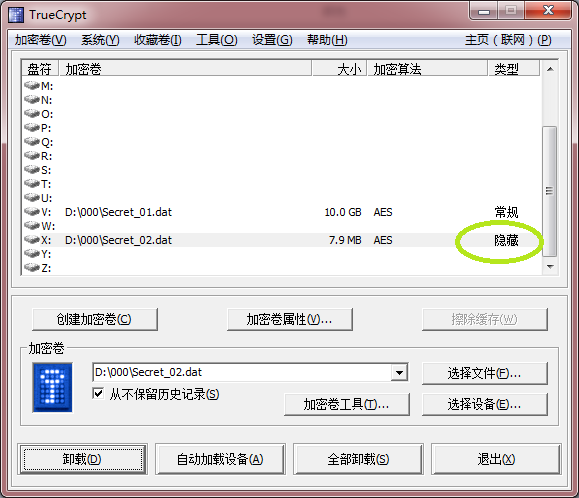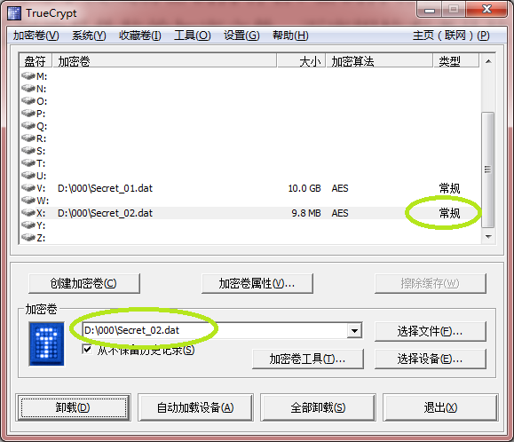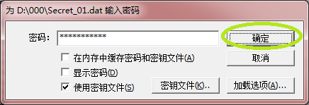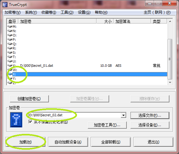 为加密卷选择一个盘符,例如X:,定位到Secret_02.dat加密卷,点“加载”按钮
