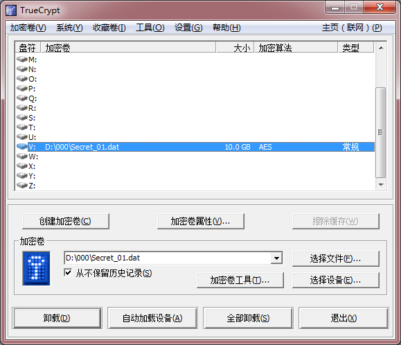 加密卷被创建以后,就好像制造了一个保险柜,创建时的密钥就是保险柜钥匙。打开保险柜的过程在TrueCrypt中叫做“加载”,保险柜打开后,可以在资源管理器中进行文件(夹)的复制、粘贴、剪切、删除、重命名等操作,操作完成后记得关闭保险柜,关闭保险柜的过程在TrueCrypt中叫做“卸载”,在默认情况下,一个加密卷被加载后,如果10分钟内没有进行任何操作会被自动卸载,以保障数据安全。