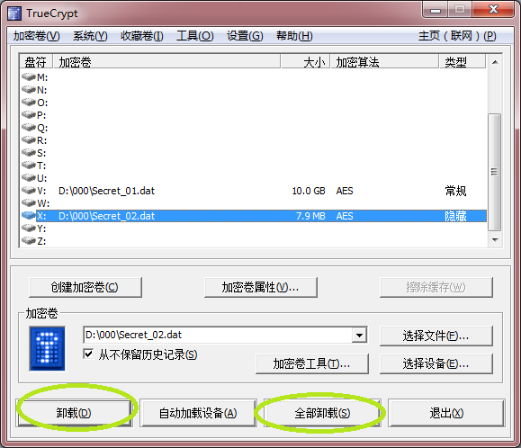 选择已打开的加密卷,点击“卸载”按钮可卸载该加密卷;点击“全部卸载”按钮可卸载所有已打开的加密卷