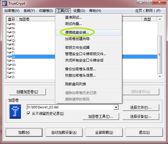 并不是每台电脑都安装了TrueCrypt,如果经常需要在他人电脑上使用TrueCrypt,那么重新安装TrueCrypt不但麻烦而且还可能招来他人的不满,针对此种情况TrueCrypt提供了“便携磁盘安装”工具,即把TrueCrypt放进U盘、移动硬盘等可移动设备中,直接双击即可使用。