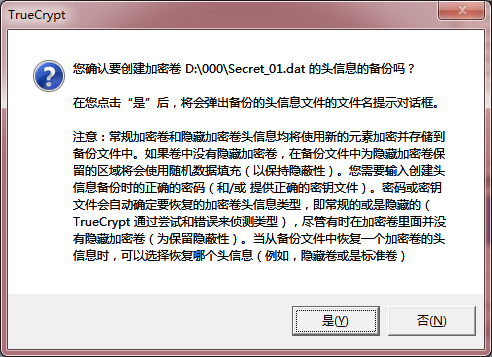 将加密卷Secret_01.dat的头部信息备份存储在文件Secret_01.bak中,然后将此bak文件发到电子信箱中,这样可以保障备份文件的安全。注意,别人即使获取了此bak文件,依然无法破解加密卷,因为此bak文件只是用来修复、恢复受损的头部信息,并不能从此bak文件中获取密钥的明文。